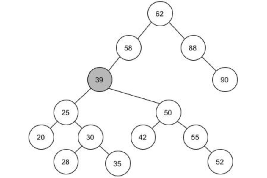 还有一种方法就是找到一个结点将目标结点40替换掉。这样的结点在上图中有两个,结点39和结点42。因为这两个结点的是最接近目标结点的两个结点,用这两个来替换对树的影响最小。我们把这两个结点称为结点40的前驱和后继。左图用前驱结点39来替换,右图用后继结点42来替换。